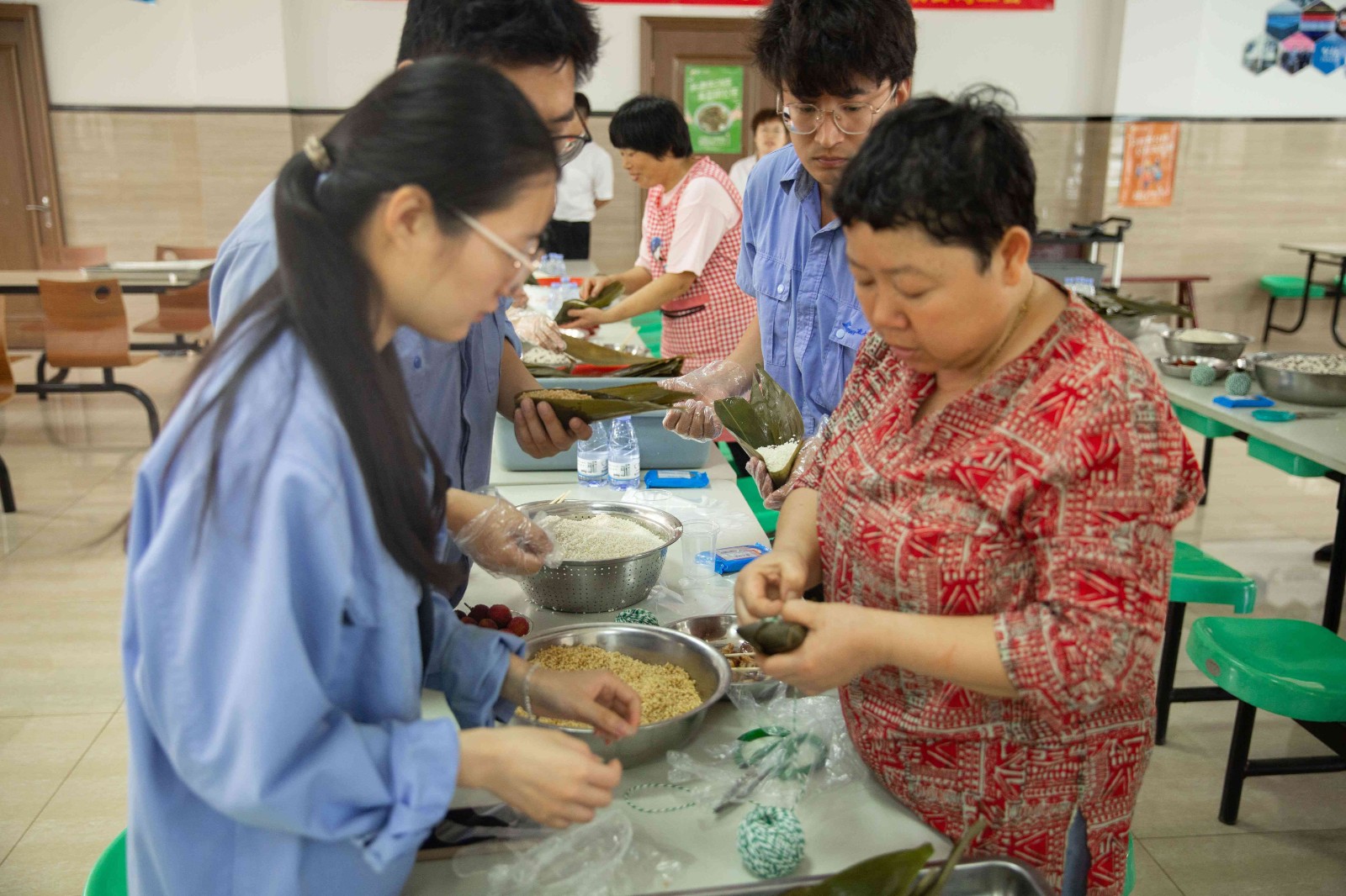 包粽子現場,職工們分工默契,熟練地捋粽葉、做漏斗狀、填糯米、壓緊實、封口、扎捆,一個個有模有樣的粽子迅速成型,現場被歡樂和諧的節日氣氛包圍,其樂融融。